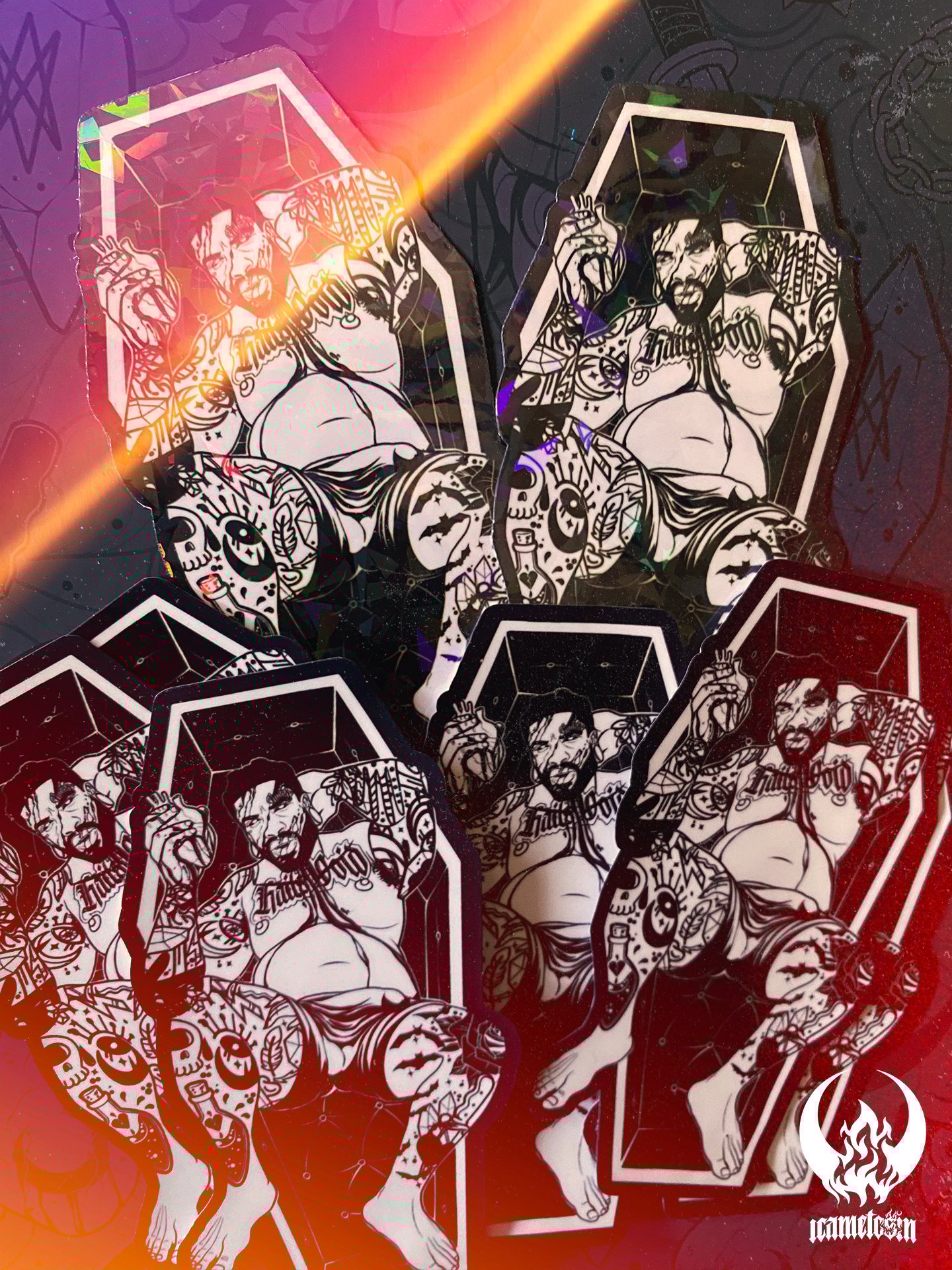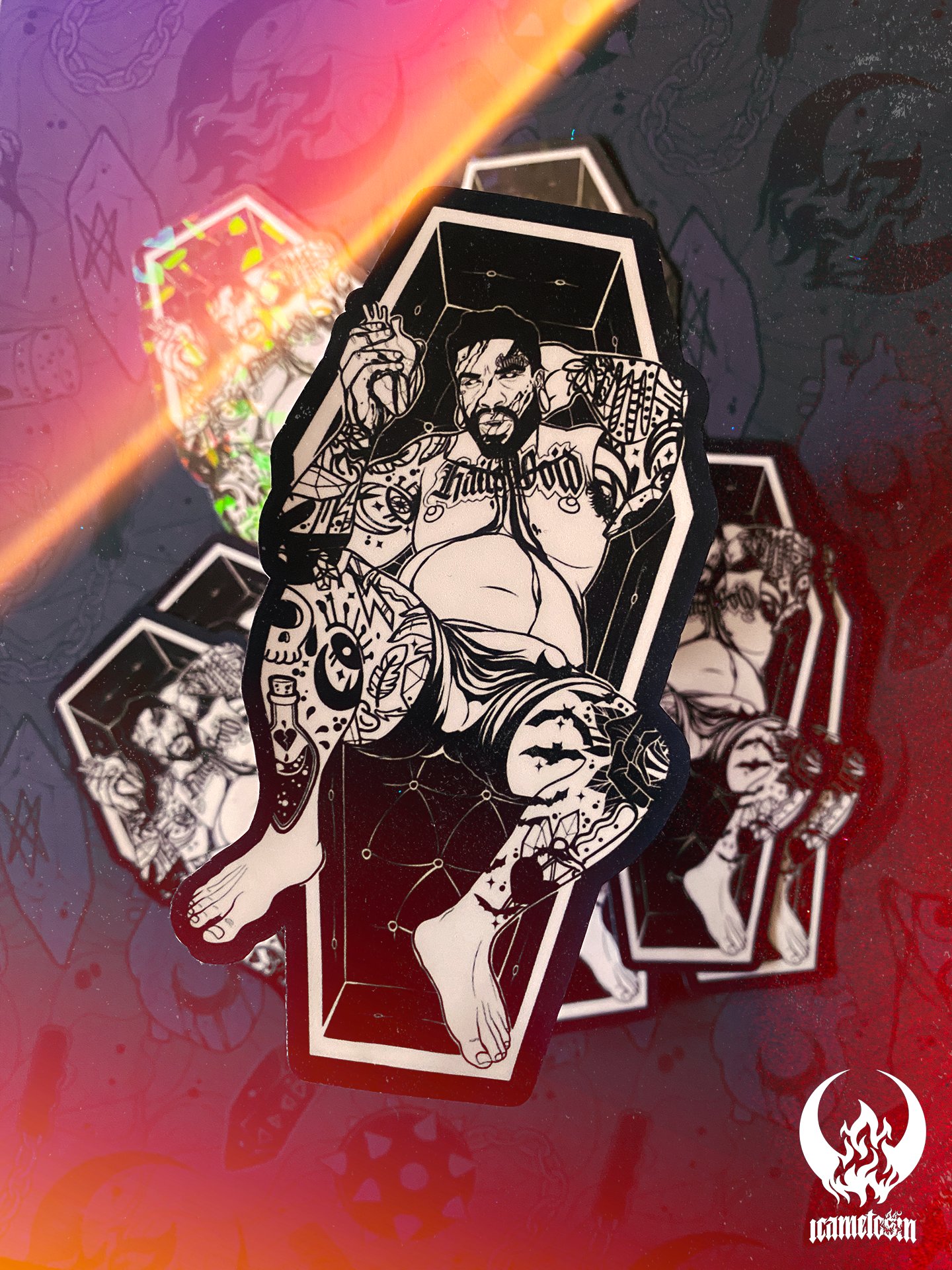 I love vampires as you will see in my art. I wanted to do a simplistic black and white vamp daddy. This one comes in Holographic, Matte and Glossy Variants.